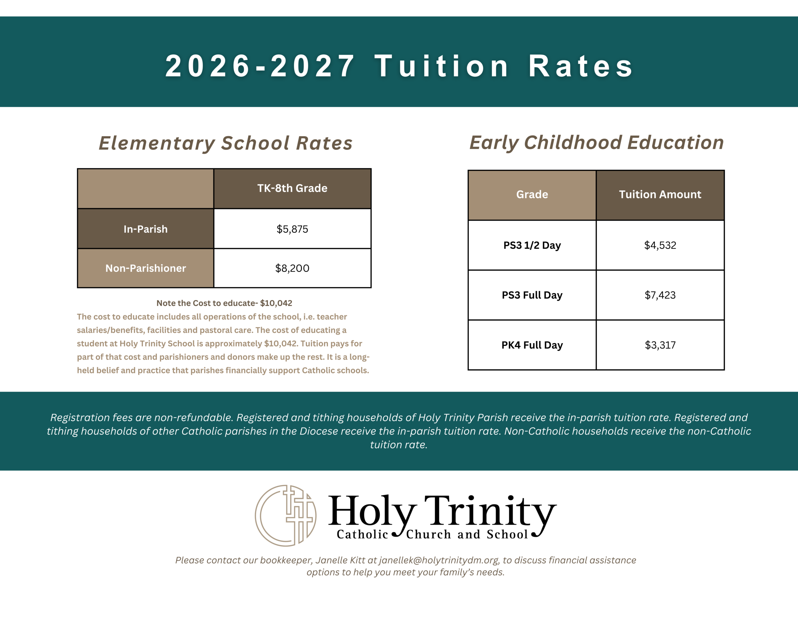 Registration fees are non-refundable.Registered and tithing households of Holy Trinity Parish receive the in-parish tuition rate. Registered and tithing households of other Catholic parishes without schools receive the in-parish tuition rate. Non-Catholic households receive the out-of-parish tuition rate.